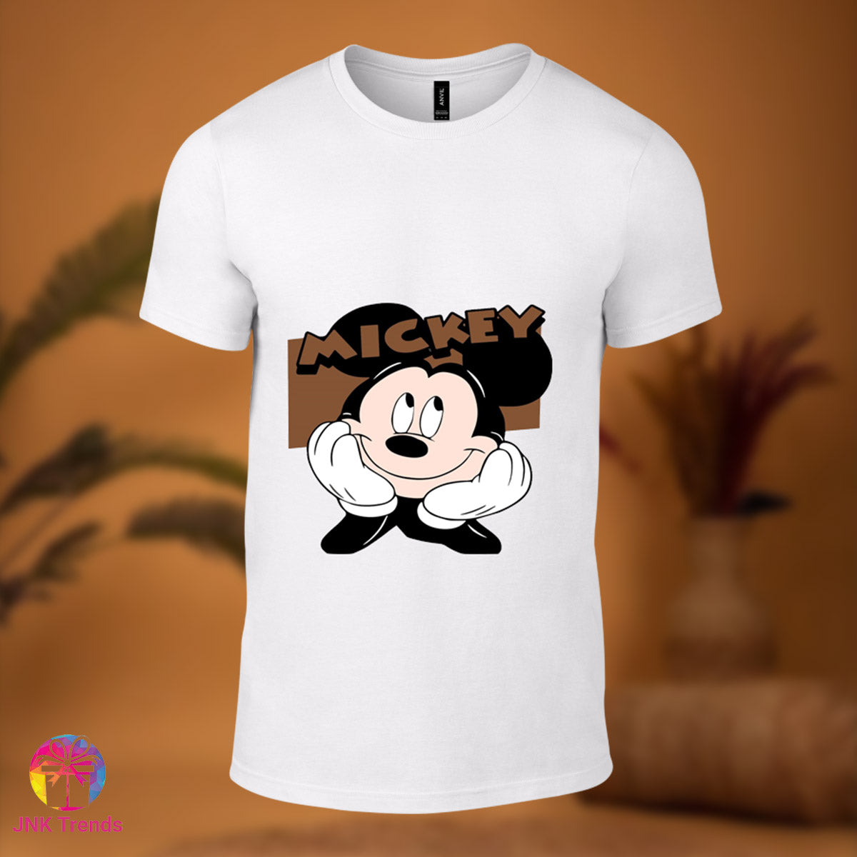 This Cute Mickey- Printed White Tshirt is the perfect addition to any wardrobe. Made with high-quality material, it features a charming Mickey design that is sure to make a statement. With its stylish look and comfortable fit, this shirt is both fun and practical. Update your style with this must-have tshirt.