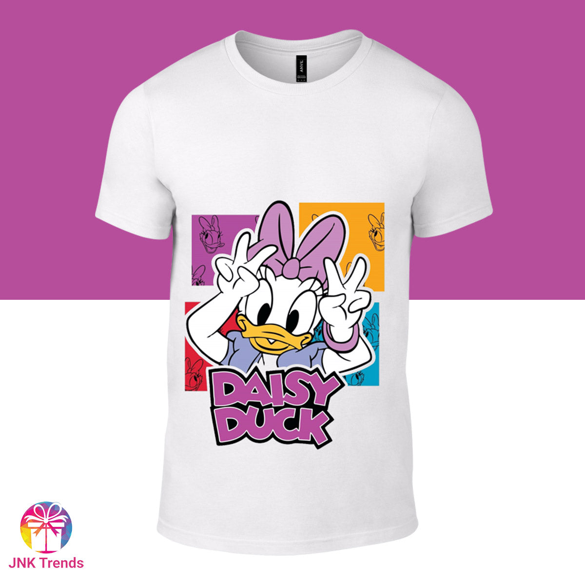 This Daisy Duck printed white t-shirt is perfect for any Disney fan. Made with high-quality materials, the shirt features a vibrant and intricate print of the iconic character. Show off your love for Disney and add a touch of whimsy to your wardrobe with this unique t-shirt.